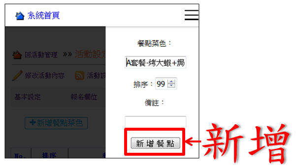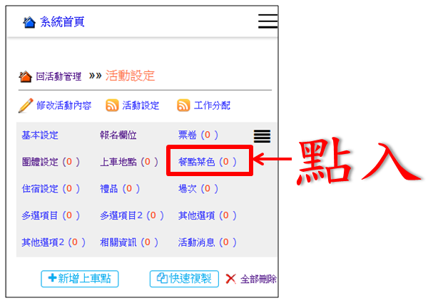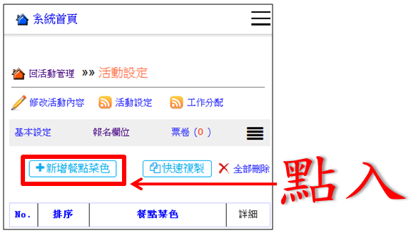 操作路徑:活動管理 -> 設定 -> 餐點菜色