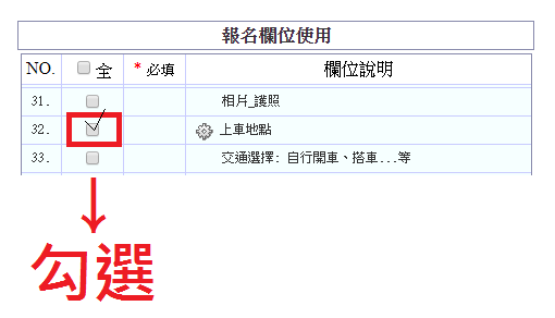 【★ 注意 ★】 需至「報名欄位」將此項勾選,報名表才會出現此選項