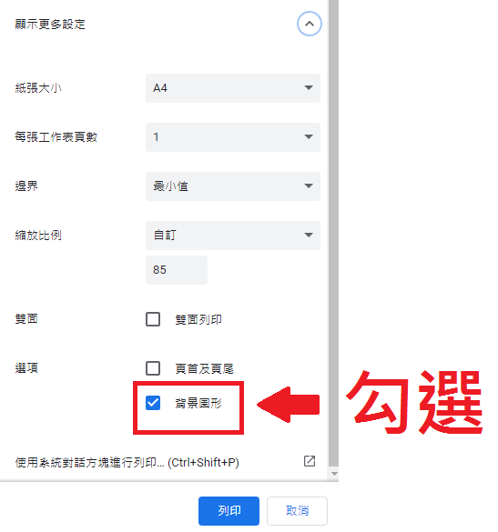※ 提醒:如需列印背景圖,需至「設定」勾選