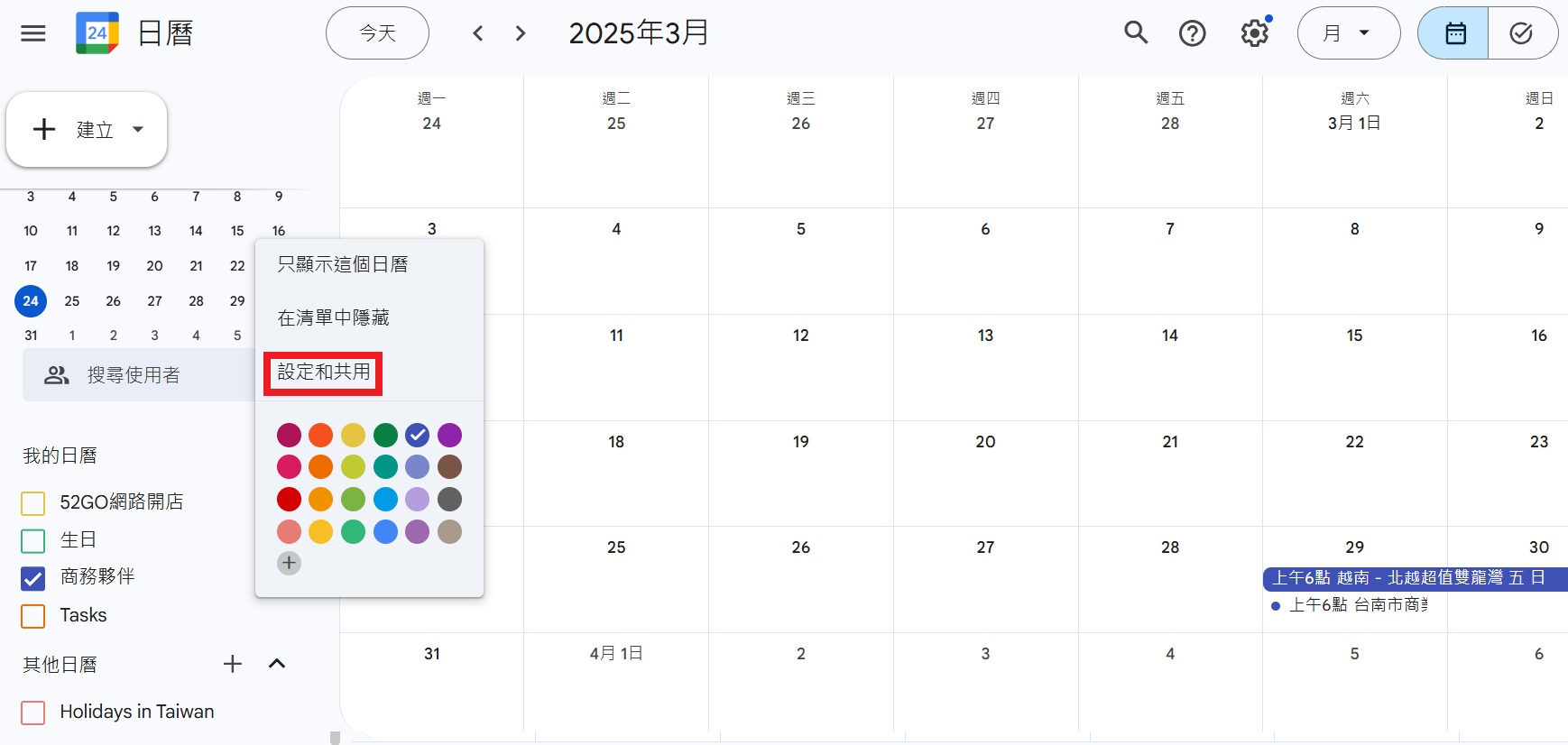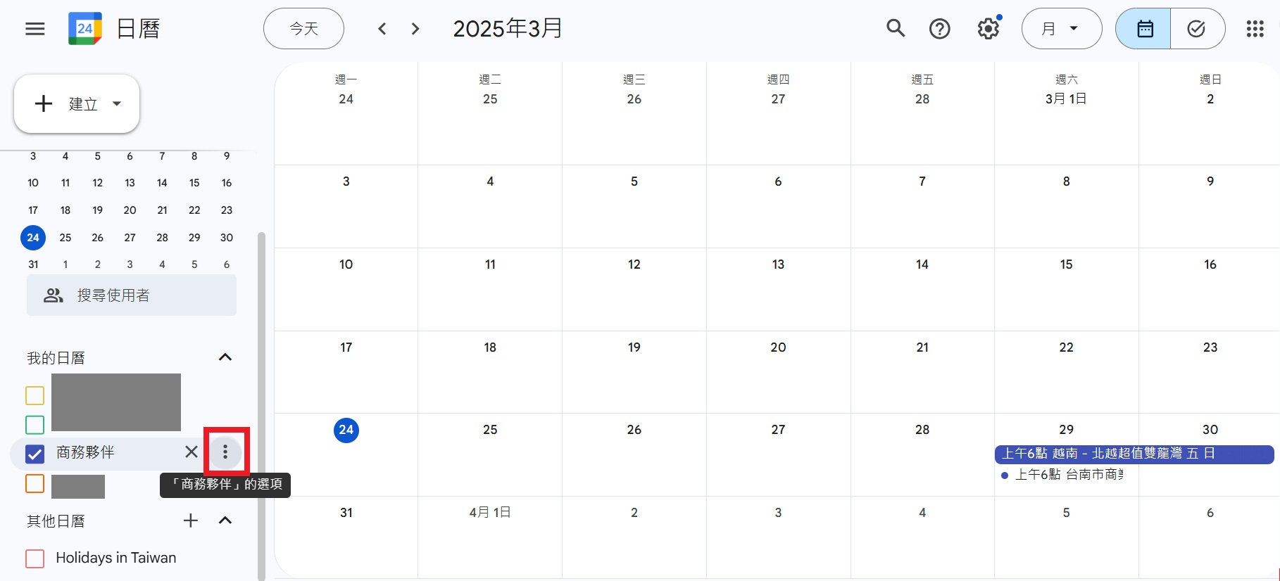 進到Google行事曆的畫面中,對想要公開的類別「我的日曆」按圖示紅框中的選項