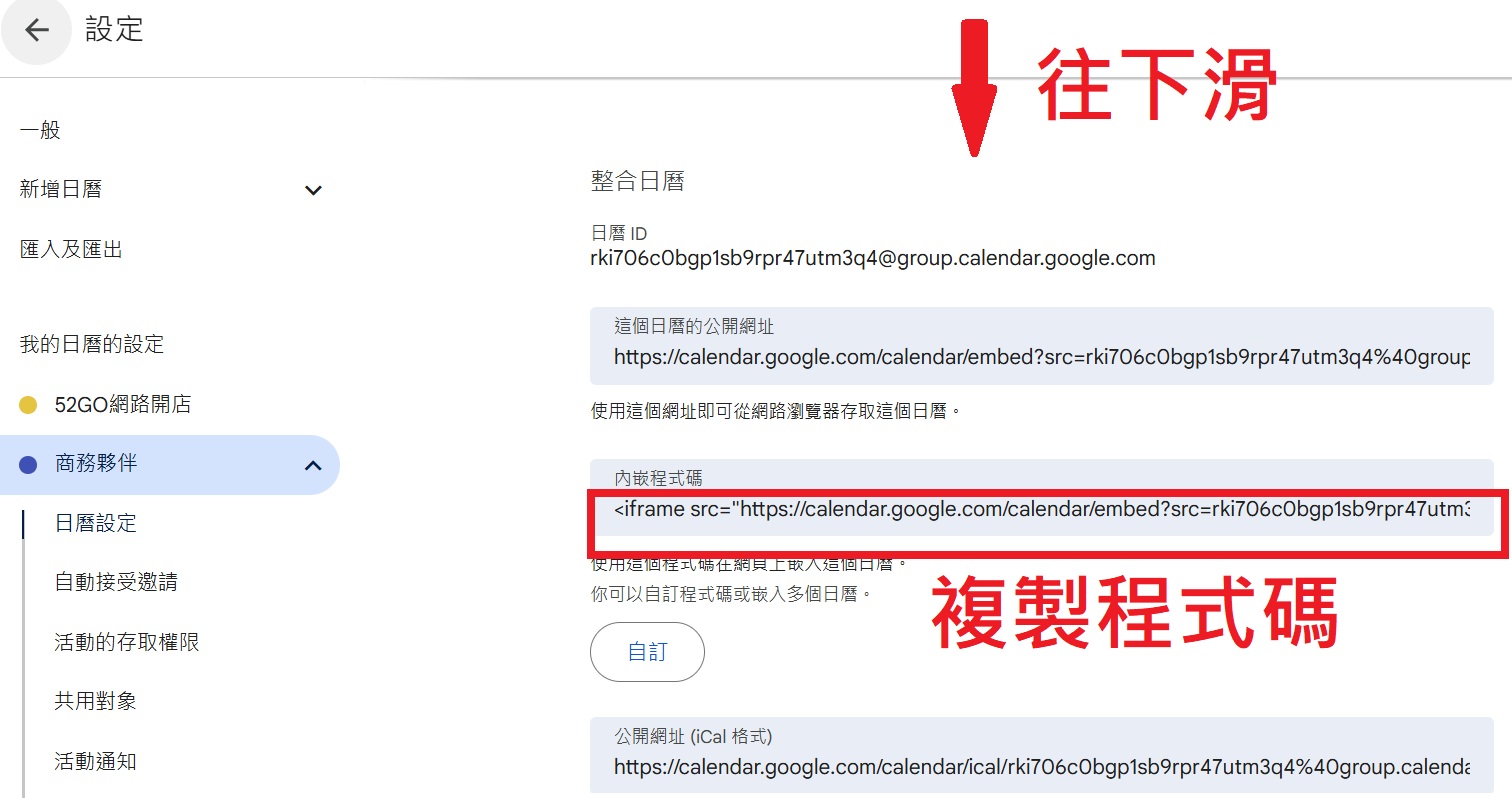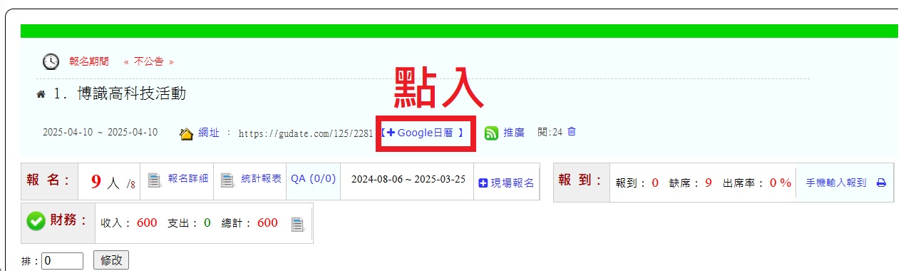 操作路徑:網頁模組 -> 活動管理 -> 找到要加入Google行事曆的活動
